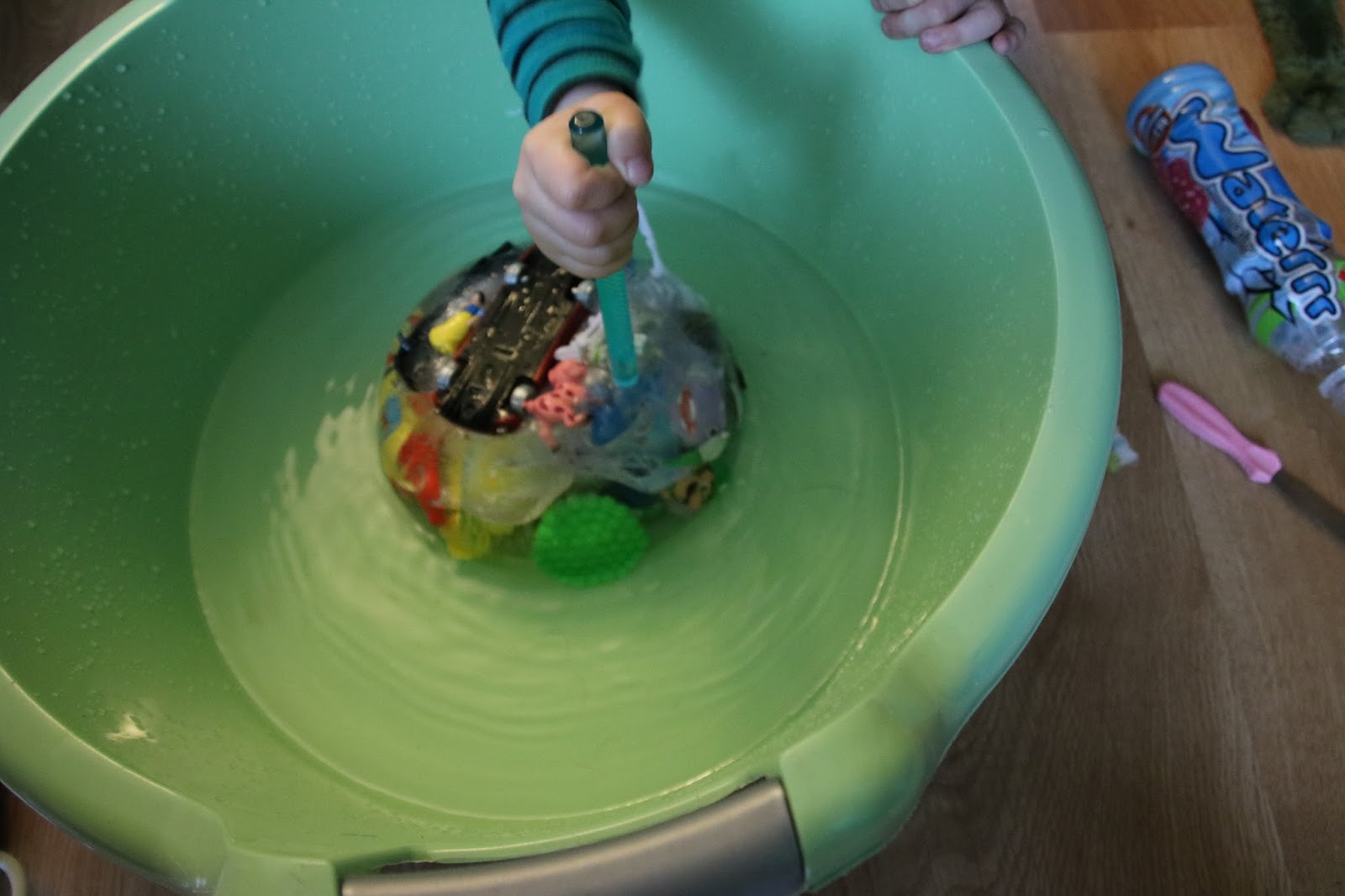 Tym razem poszłam krok dalej i zamroziłam miskę z wodą a w niej zabawki.